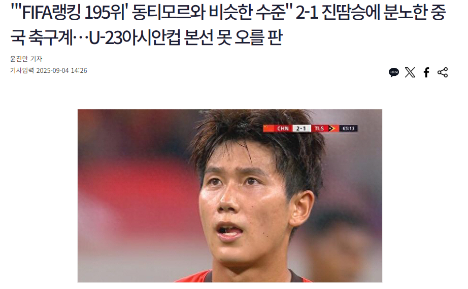 雷速体育9月4日讯 U23亚洲杯预选赛首轮2-1险胜东帝汶取得开门红后,韩国媒体《朝鲜体育》也对中国国青的表现进行了点评,认为中国队借助主场之利,而且对手是半业余性质,只仅赢1球之后中国足球再度让球迷感受痛苦。