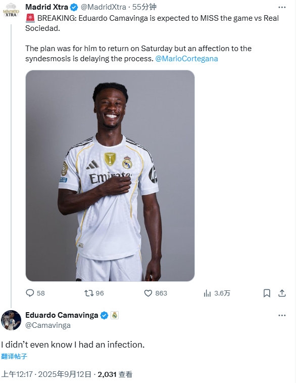 09月12日讯 此前据The Athletic记者Mario Cortegana报道,皇马中场卡马文加预计将缺席客场对阵皇家社会的西甲联赛。
