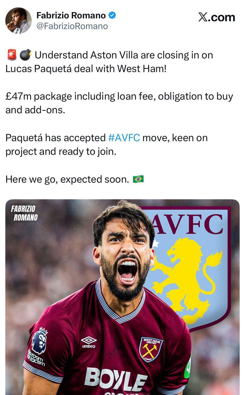 值得一提的是,就在不久之前,罗马诺还表示,帕奎塔即将加盟阿斯顿维拉。罗马诺此前写道:“帕奎塔已接受转会至维拉,他对此充满热情,并已准备好加盟。Here we go...soon。”